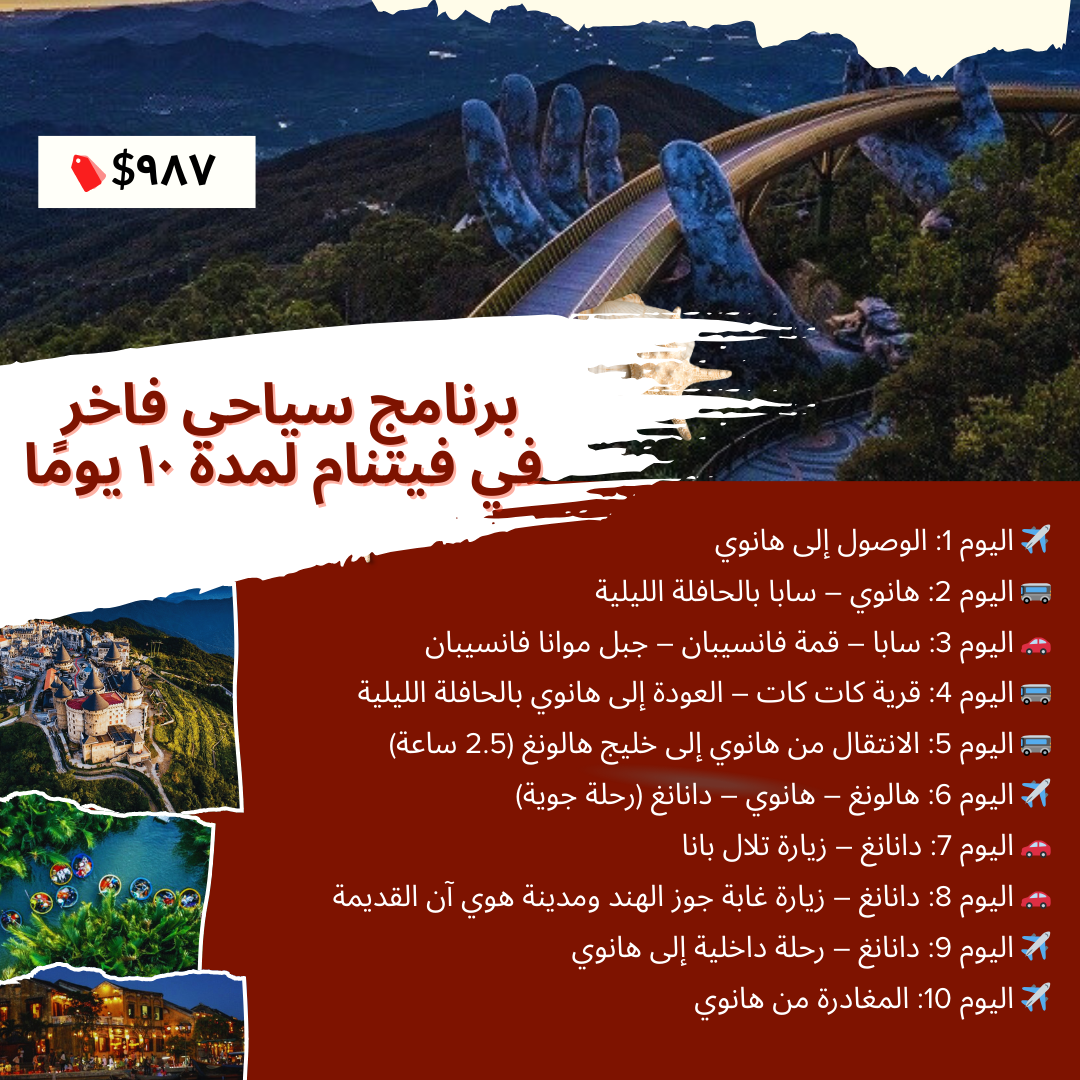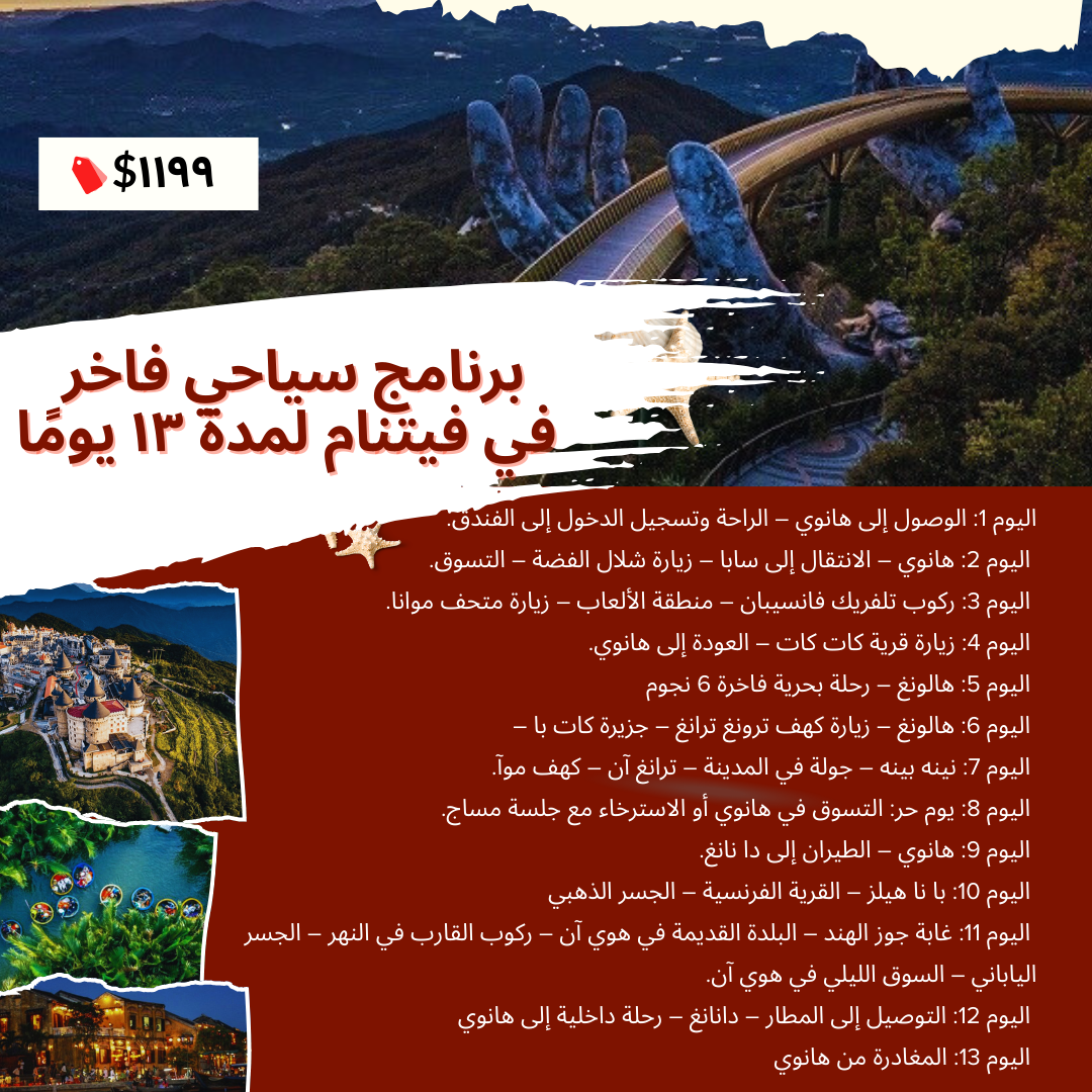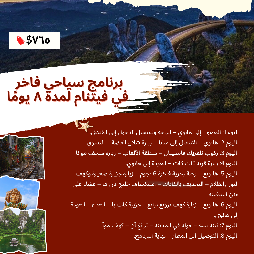 بخبرة تزيد عن خمس سنوات في تنظيم وتنفيذ الرحلات السياحية في فيتنام للزوار العرب، نلتزم بتقديم أجمل وأروع التجارب لعملائنا من خلال خدمات احترافية متميزة وأسعار تنافسية تُعد من الأفضل في السوق