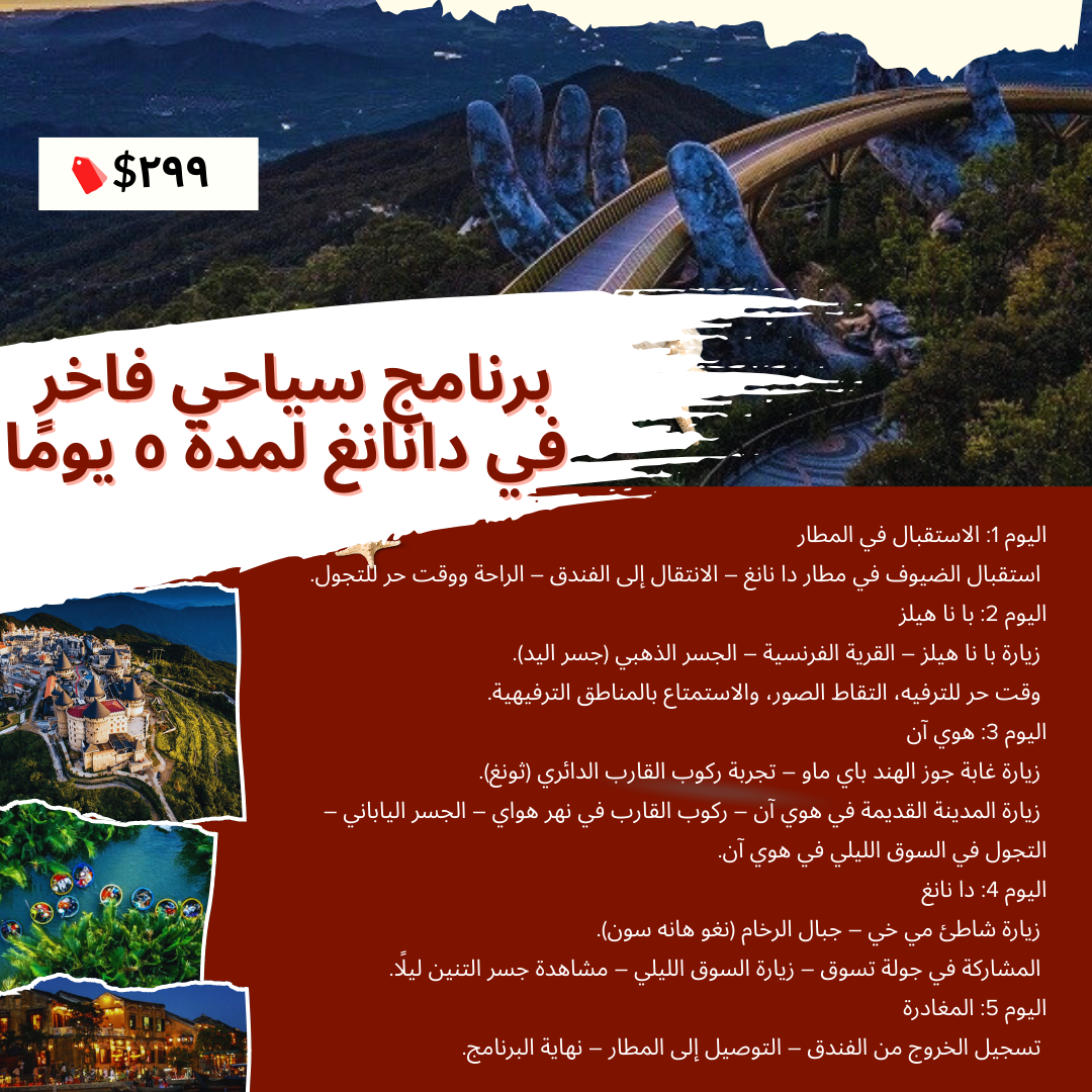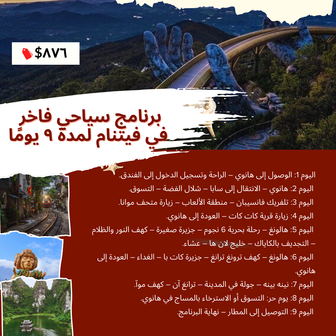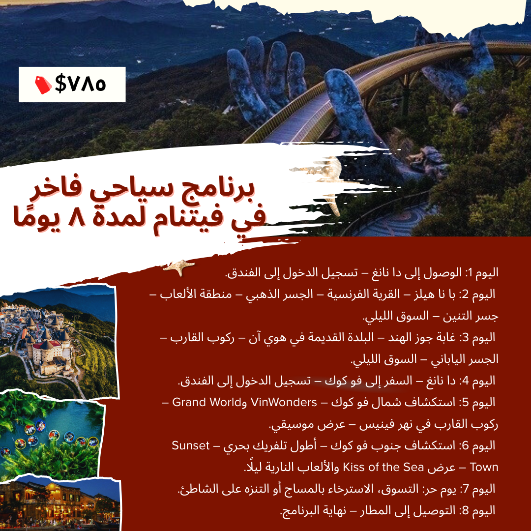 بخبرة تزيد عن خمس سنوات في تنظيم وتنفيذ الرحلات السياحية في فيتنام للزوار العرب، نلتزم بتقديم أجمل وأروع التجارب لعملائنا من خلال خدمات احترافية متميزة وأسعار تنافسية تُعد من الأفضل في السوق